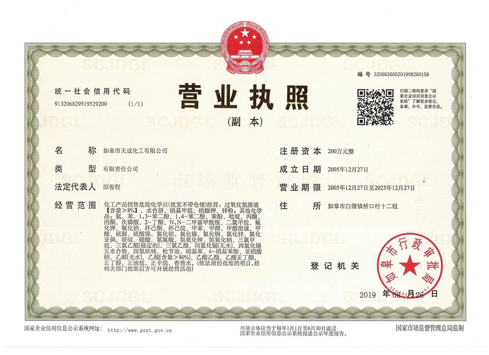 ? 如皋市天成化工有限公司創(chuàng)建于1996年。公司地處于美麗富饒的長江三角洲,座落在古鎮(zhèn)林梓,通揚(yáng)運(yùn)河河畔。南瀕長江、西臨204國道,距南通港、飛機(jī)場30公里,立體交通發(fā)達(dá)。公司經(jīng)營管理規(guī)范,技術(shù)力量雄厚,擁有一批高、中級專業(yè)技術(shù)人才。